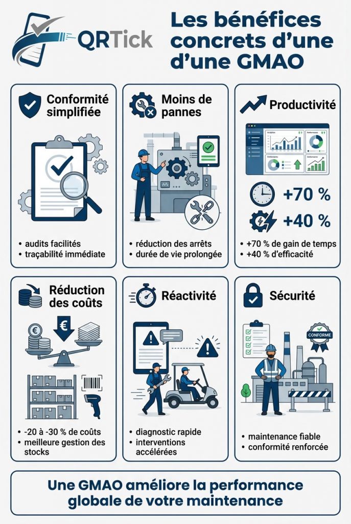 Réduction des coûts : La maîtrise des stocks et l’optimisation des interventions permettent de réduire les coûts de maintenance de 20 à 30%, selon les retours des utilisateurs.