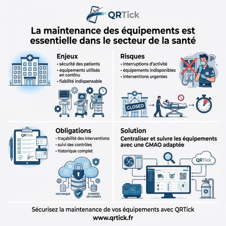 Une GMAO utilisée dans le secteur de la santé est un logiciel qui permet de suivre la maintenance des équipements médicaux, du matériel et des installations techniques. Elle permet de conserver l’historique des interventions et d’assurer un suivi structuré.