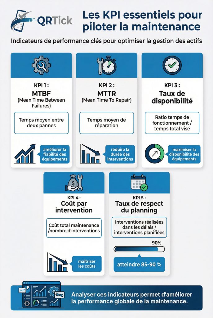 Coût par intervention | Coût total (main d’œuvre + pièces) / nombre d’interventions | Maîtriser le budget maintenance |